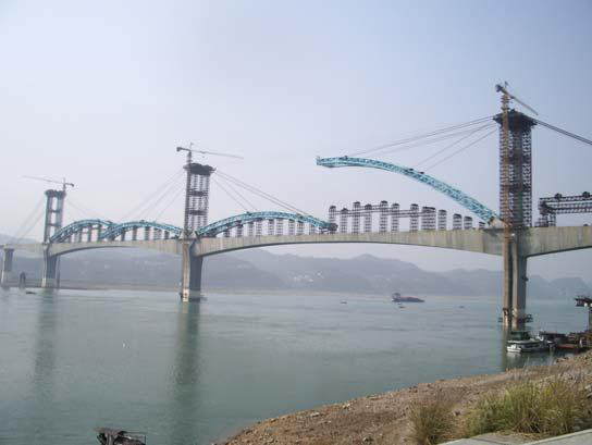 宜萬鐵路宜昌長江大橋,是宜萬鐵路上橫跨長江的特大型橋梁。主橋?yàn)閮煽缈缍葹?span style="font-family:Arial;font-size:12pt;">270 米的下承式鋼管混凝土拱橋。每跨鋼結(jié)構(gòu)主拱重約 1300 噸,采取橋面低位拼裝,豎轉(zhuǎn)到位的安裝工藝。